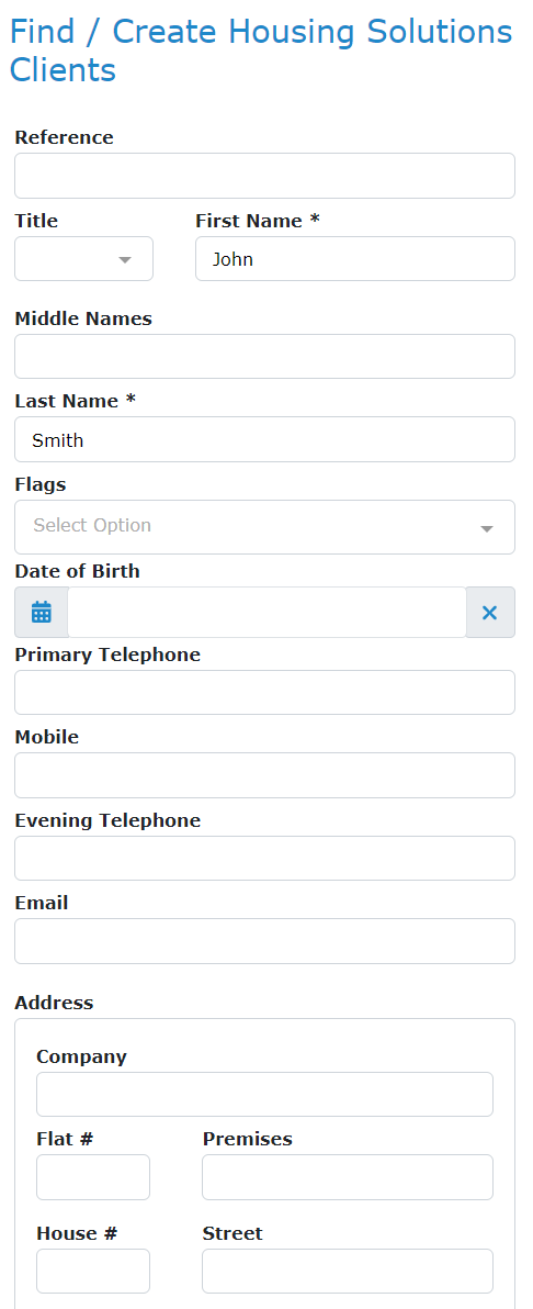 If there is no matching client on the system, we must assume this is a new client. To create a new client record, complete as much of the client profile as possible with the information you have, or the client/referrer can give you in the fields on the left hand side of the Case Hub screen.