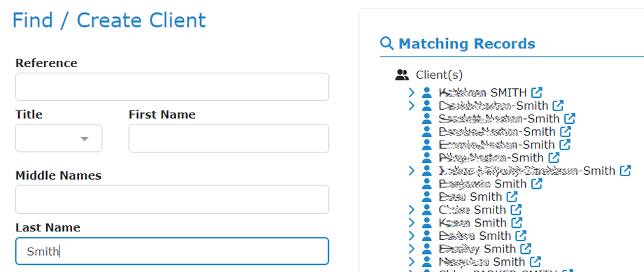 Any clients matching the details entered will appear in a list in the central section of the screen.