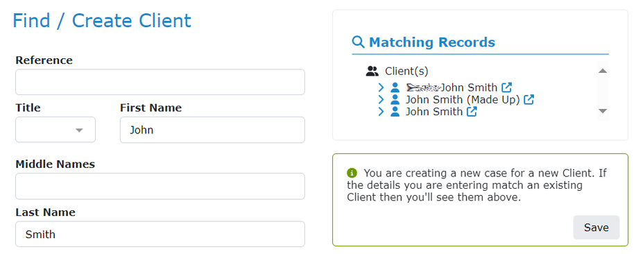 Entering data into the fields on the left of the screen will cause the system to look for matching clients from the existing client database. You can use any of the fields on the left-hand side, but typically, you will use the first and last name fields.