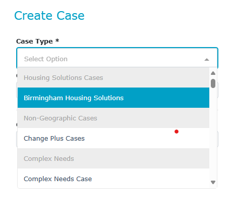 From the Create Case menu on the right-hand side of the screen, click the Case Type dropdown menu and choose the appropriate case type from the list. Your list may contain a single option or multiple options, depending on the team you work for.