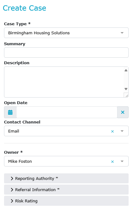 Once you have selected the case type, the display will change, and the system will display additional fields. Some of these fields are required, and others are optional.