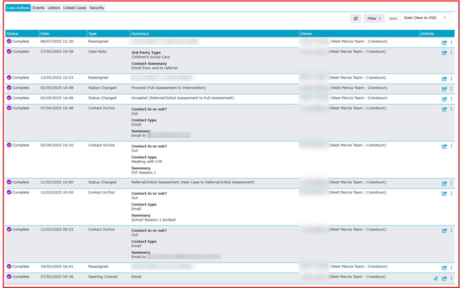 Case actions are all marked with a purple tick when completed. Other case actions could be marked in Green (not yet due), Amber (due in less than a week), or Red (overdue). All Cases Actions and Assessments must be completed before a case can be closed.