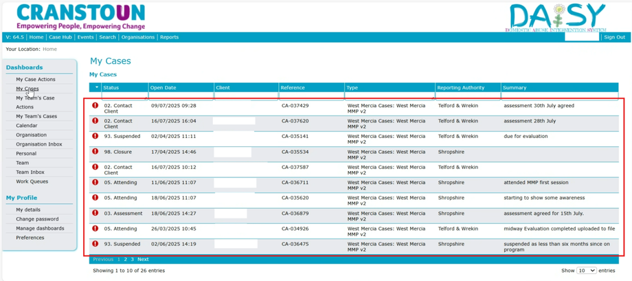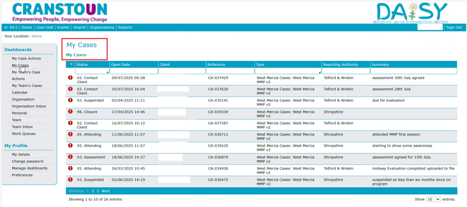 The case listing module appears in multiple screen on the system, the features are identical or similar on each page.