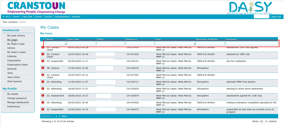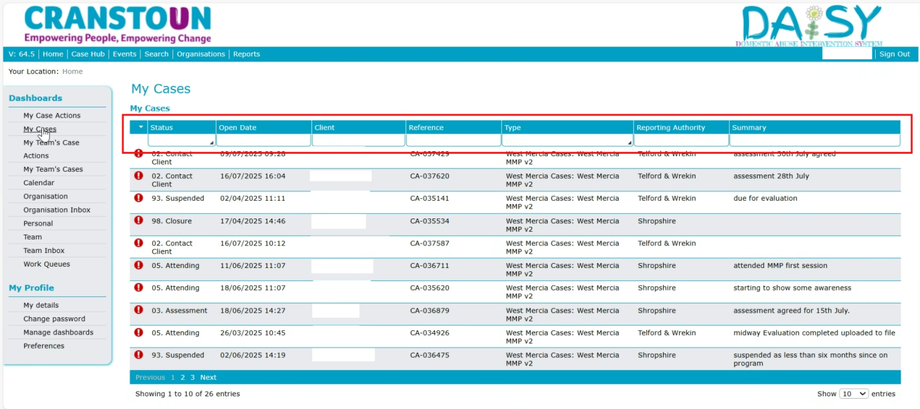 These allow you to filter the cases displayed using one or more criteria. Once filtered, you can still sort the columns by clicking the headers.