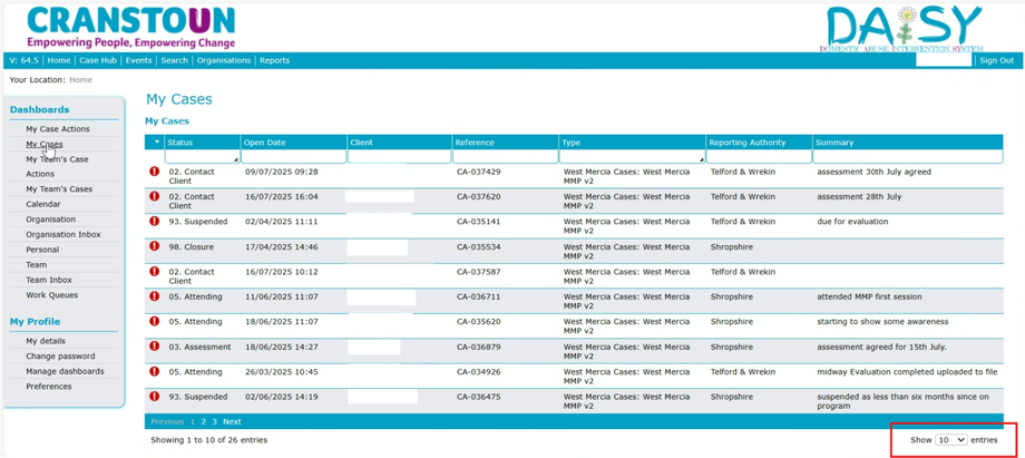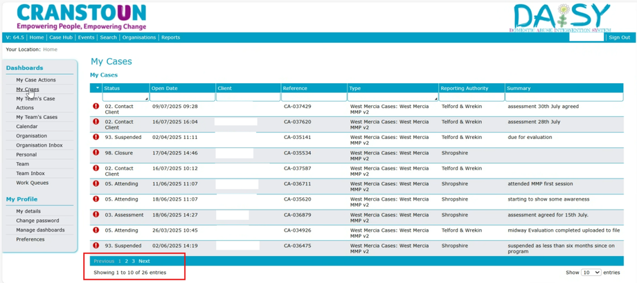 By default, the system shows you 10 cases on a page, and this indication shows you how many pages of cases you have assigned to you.