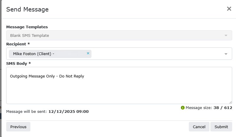 Complete the SMS Body Section, leaving the “Outgoing Message Only - Do Not Reply” at the bottom of the message. You cannot change the recipient or mobile number.