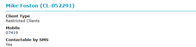 On the Client Details screen, the client have a valid mobile number, with no additional text visible.