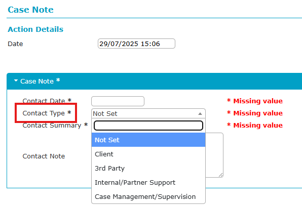 This is for any communication directly about the client, but with anyone other than the client. If you choose 3rd Party, an additional drop-down appears requesting the 3rd Party Organisation.