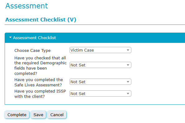 The Assessment Checklist (Victim) must be completed to allow you to move the case forward to Ongoing Support status.