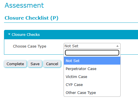 We are unable to identify the case type at this point, so you need to choose between Perpetrator/Victim/CYP or Other which will then give you the correct checklist to complete.