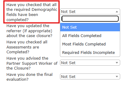 A closure checklist must be completed before a case can be closed. This checklist is designed to ensure that we have completed all the tasks required by the system before closing the case.
