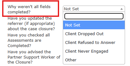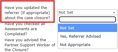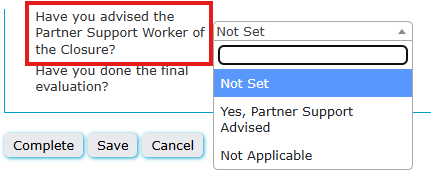 Have you informed the Partner Support worker that the Perpetrator case is being closed? You should be able to find the link to the case or the Victim in the case details. You can then email the Partner Support Worker so that they can take the appropriate action with the victim and their case.