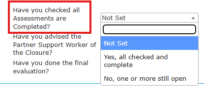 If you have any entries with a Green Arrow, Amber Triangle or Red Exclamation Mark, these assessments need to be resolved and completed before you close the case. If you are unable to complete these assessments, please log a Helpdesk ticket to have them resolved, and then close the case.