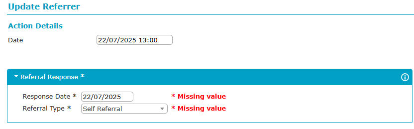 This opens a new form that needs to be completed. There are two types of referral, organisational and self. You should enter the date the referral was received and then choose the type of referral being made.